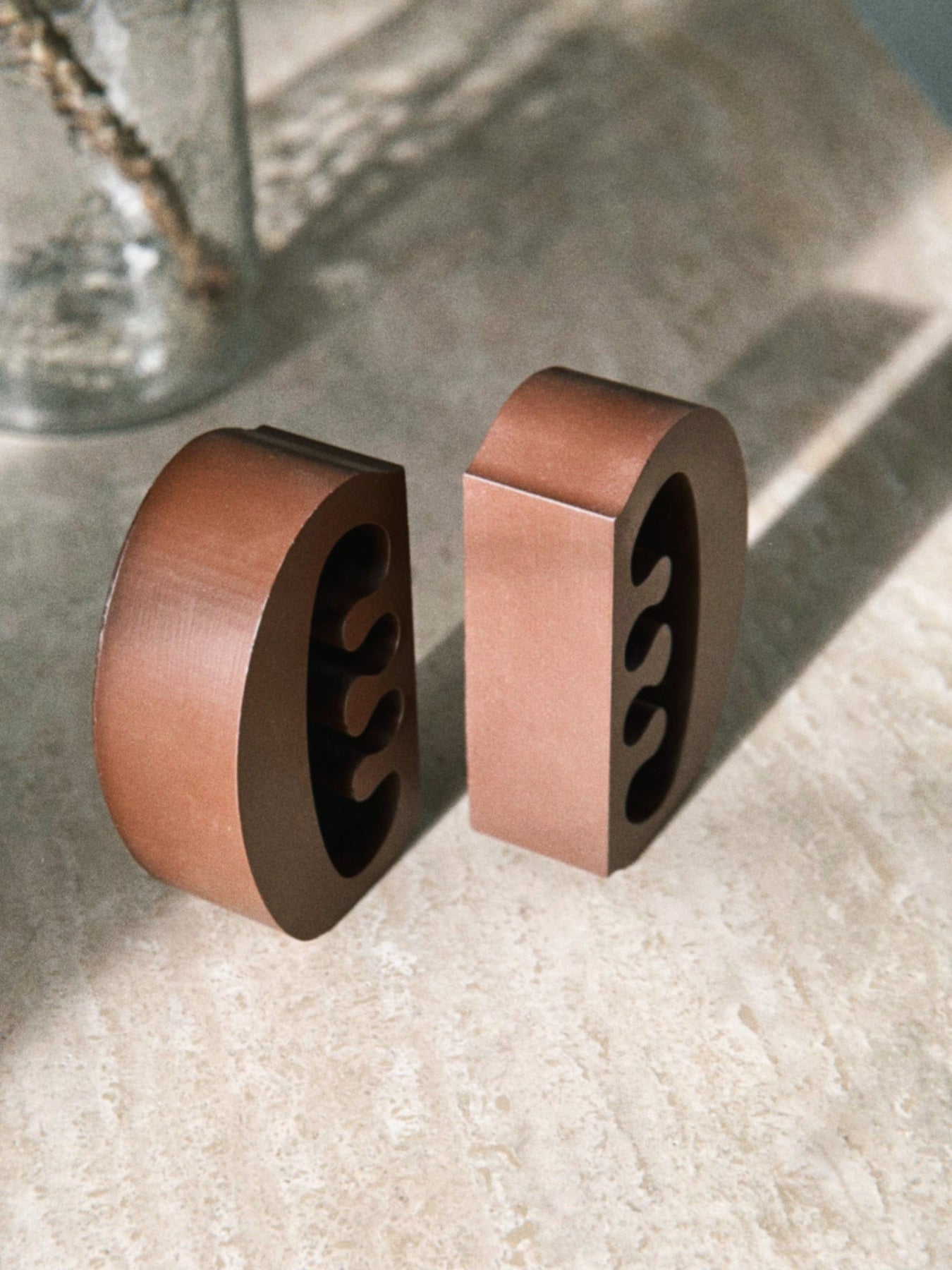 Decorative coffee coloured Ese Ne Tekrema adinkra bookends on a white plinth with a light gray lime wash background.