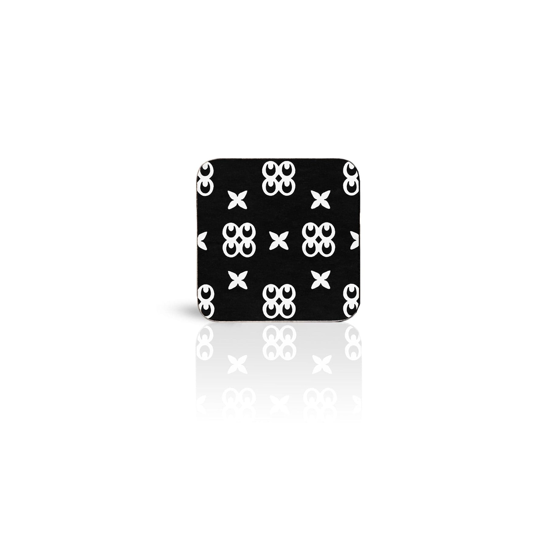 black Mate Masie adinkra square wooden coaster on white background.